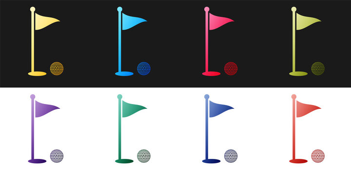 Set Golf ball and hole with flag icon isolated on black and white background. Golf course. Ball and flagstick in hole. Sport concept. Vector.
