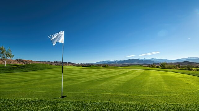 Scenic golf course with flagstick and clear blue sky in mountainous landscape