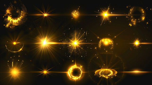 Dynamic yellow Celestial Explosion set. Black Background with Glowing golden Sunburst, Digital Lens Flare, and Color-Adjusted Light Rays