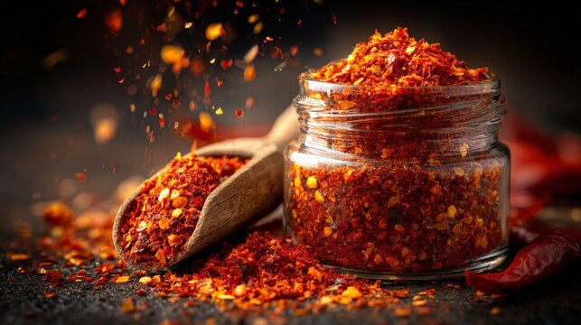 Red chili flakes are artistically displayed with a wooden scoop and glass jar, highlighting the vibrant colors and textures of spices in a dark, moody setting