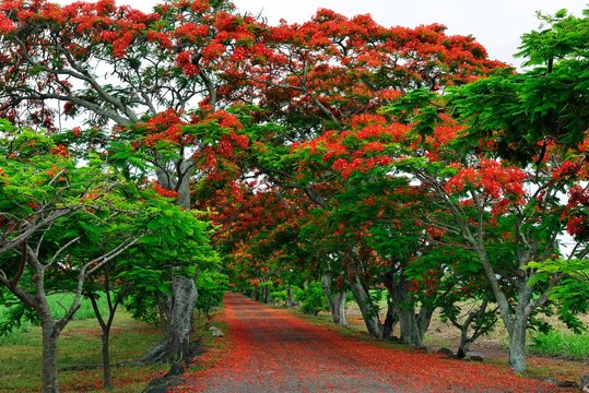 Avenue with Royal Poincianasn, Flamboyant (Delonix regia), Mauritius, Africa