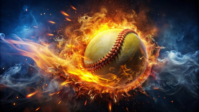 Vibrant flaming softball in mid-air surrounded by sparks and wisps of smoke against a dark mysterious black background atmosphere.