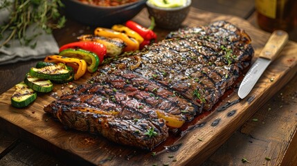 Grilled flank steak and colorful vegetables on rustic wooden board