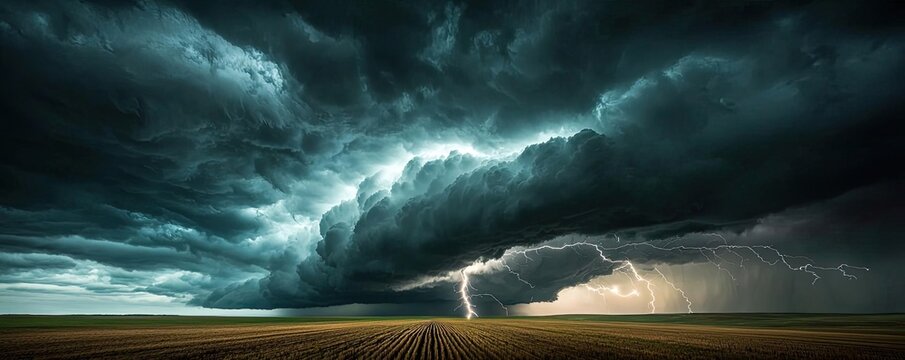 Dramatic storm clouds with lightning over a vast landscape, showcasing nature's power.