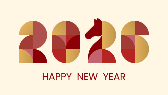 Abstract geometric background, postcard with Chinese New Year 2026. Numbers and silhouette of horse made of simple shapes in retro style in red, yellow and gold. Vector EPS10