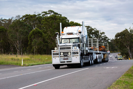 flatbed truck driving down rural road