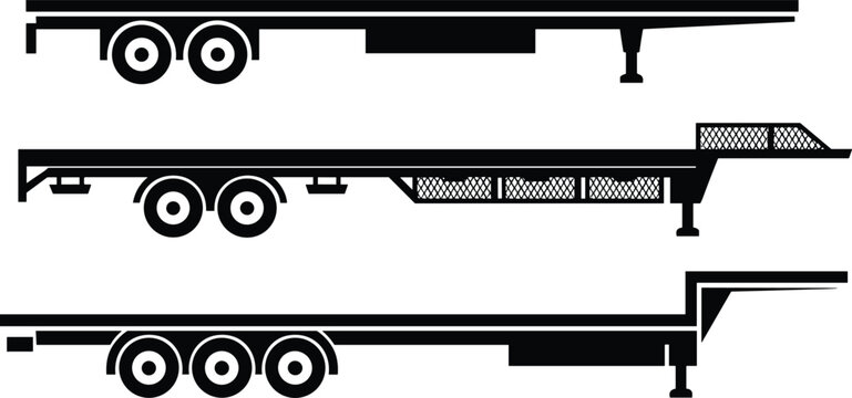 Flatbed utility trailer silhouette vector set with heavy duty cargo hauler outlines, transport truck equipment, towing vehicle design illustrations