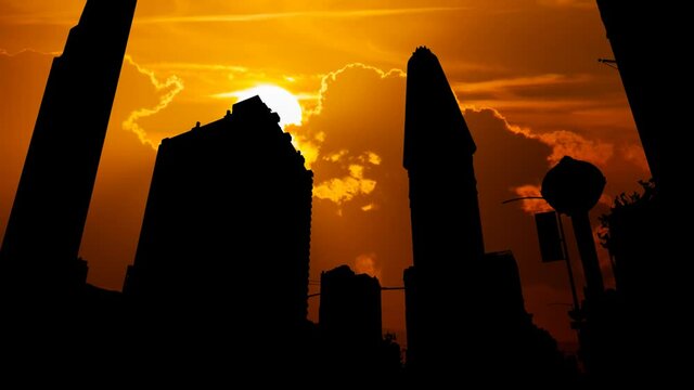 New York City Skyline: Flatiron building in Manhattan, Time Lapse at Sunset with Red Sun and Fiery Sky