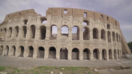 Wide angle view of the Colosseum exterior face as the camera tracks around the ancient amphitheater