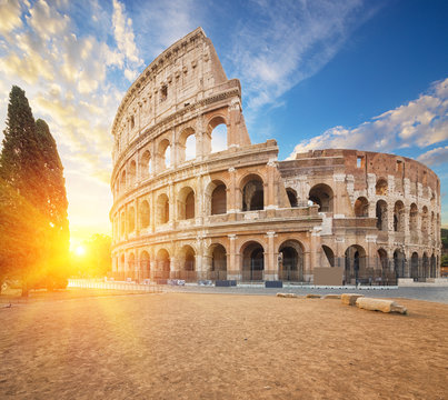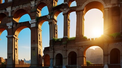 Colosseum in Rome Italy travel destination picture, flavian amphitheater on background, A majestic Roman colosseum bathed in the warm glow of the setting sun, a testament to the grandeur of ancient
