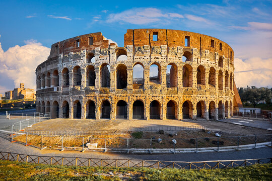 Rome, Italy. Roman Colosseum (Coliseum or Colosseo) Ancient Ruins of Flavian Amphitheatre. Arena for Gladiator Fightings. World Famous Landmark and Very Popular Touristic Destination Vacation Trip