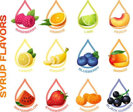 Syrup drops with various flavors vector icons collection. Flavors chart for ice-cream, coffee, alcohol drinks isolated on white background. Raspberry, orange lime, soft ice cream, peach