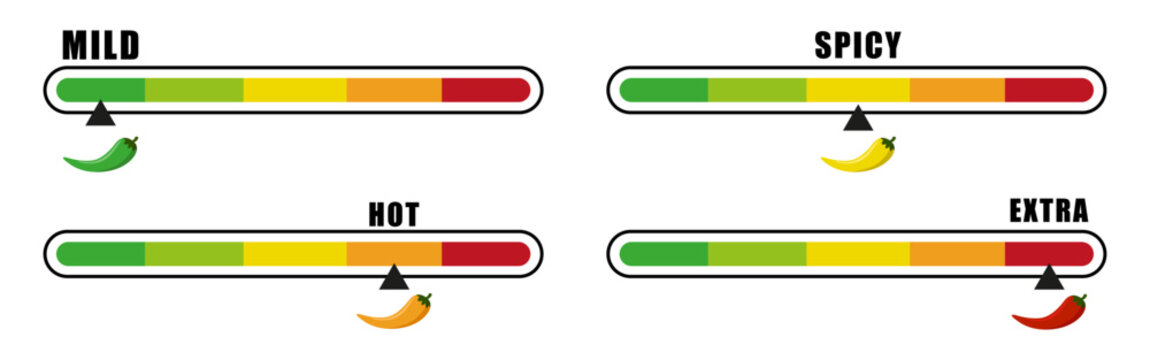 Pepper hotness indicator, mild, medium, extra hot, scale, label, chili hotness mark, and food hotness mark.