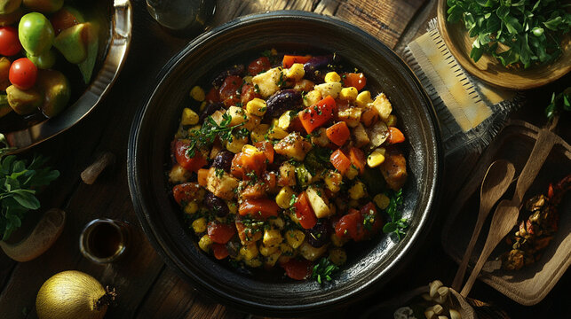 Homestyle roast chicken with fresh vegetable arrangement