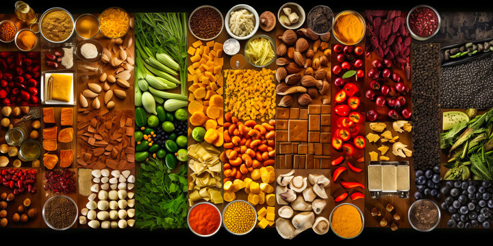 Variety of superfoods with labels promoting healthy living