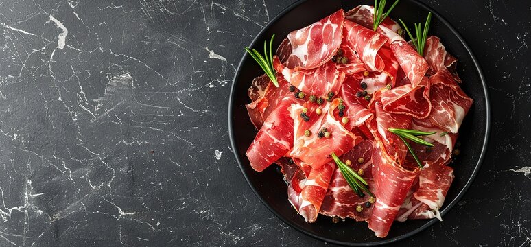 A plate of thinly sliced cured meat, likely prosciutto, with rosemary sprigs and peppercorns on a black plate on a marble background.