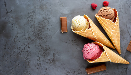 Assorted ice cream flavours in delightful waffle cones, a treat for every taste bud. Over stone background with copy space. Flat lay