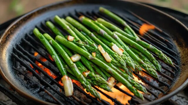 Fresh green asparagus spears being cooked on a grill, enhancing their natural flavors and making them a delicious outdoor dish.