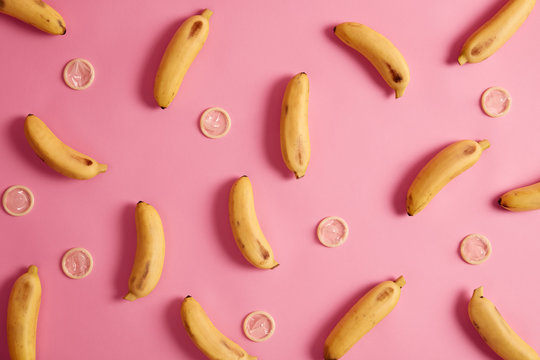 Bananas and contraceptives on pink background. Tropical flavored condom for safe relationship. Elimination of pregnancy risk. Health care provider. Condom tested for strength, flexibility, reliability