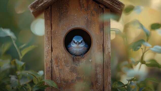 Baby bluebird peeking out of nesting box observing environment, highlighting nesting habits and fledgling growth