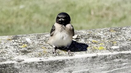 Swallow fledgling perches on a wood railing