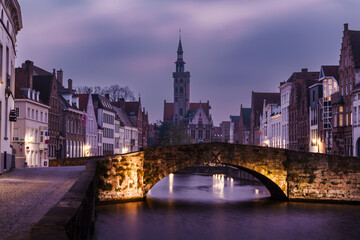 Twilight settles over the tranquil canals and medieval buildings of Brugge, Belgium, with a stone bridge in the foreground