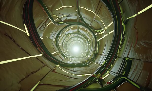 Sci-fi horror video of a tunnel made of living tissue and glowing green veins pulsating through dark wet surfaces