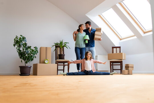 Portrait of happy caucasian family moving in new apartment with flexible little girl doing gymnastics exercise and parents carrying belongings.