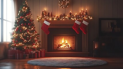 Charming Christmas living room, traditional tree with red and gold decorations, stockings on the mantel, fairy lights providing a soft glow, cozy fireplace with flickering flames,