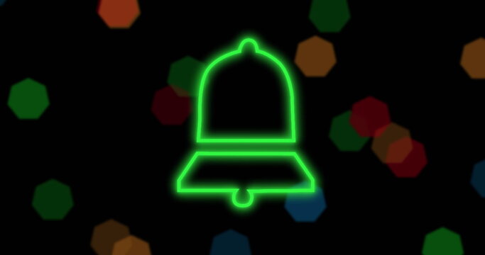 Image of christmas blue sign with copy space, snow falling and christmas fairy lights flickering
