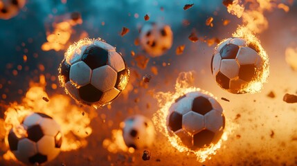 Flaming soccer balls explode in fiery chaos.