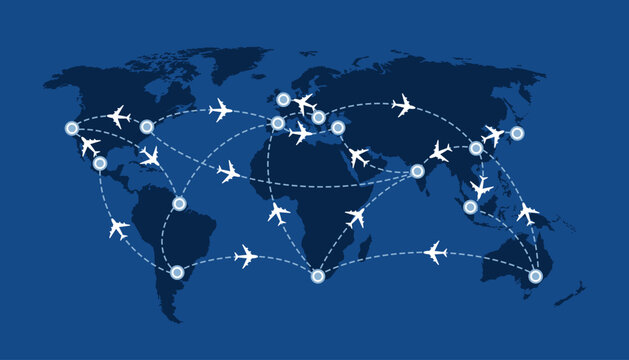A stylized world map with dotted flight paths and airplane icons over a dark blue background