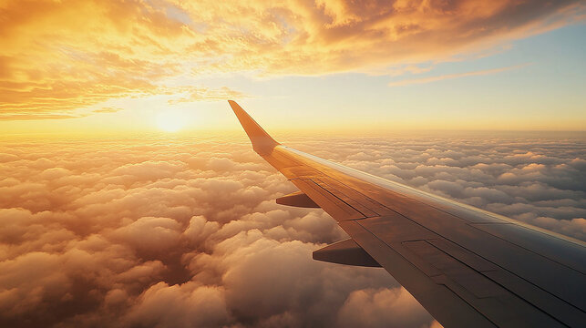 Beautiful sunset view from airplane wing over soft clouds during flight at dusk