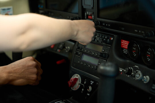 Pilot adjusting aircraft control panel switches while monitoring instruments and taking notes with pencil. Ideal for aviation, pilot training, navigation, communication, technology, precision