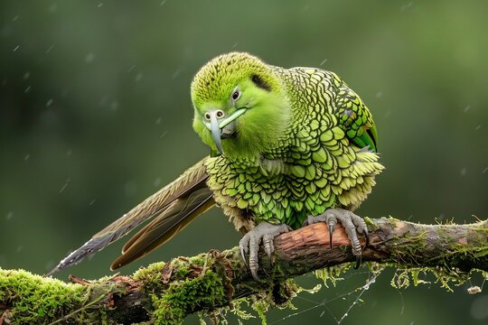 A kakapo parrot perched on a mossy branch in New Zealand, fluffy green feathers, nocturnal and flightless, one of the rarest birds