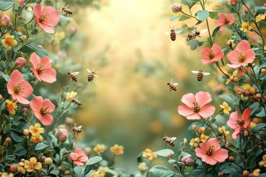 Spring Fling festival light pink background with decorations in green and a large space in the middle for text. Spring Fling format, such as flowers on both sides of the frame. Bees around. Bright