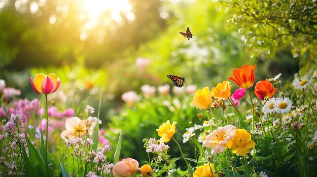 A vibrant garden in full bloom, showcasing an array of colorful flowers such as roses, tulips, and daisies. Butterflies and bees flit gracefully among the blossoms,