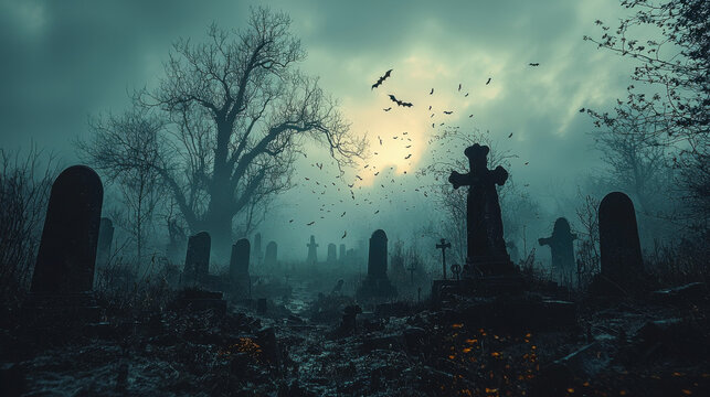 A spectral symphony of shadows and secrets unfolds in a haunted graveyard, where skeletal trees cast eerie whispers and bats, ethereal messengers of the night, flit among the tombstones. Happy