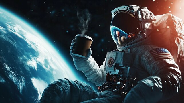An astronaut in a spacesuit casually sipping coffee from a floating cup while gazing at Earth from the outside of a space station