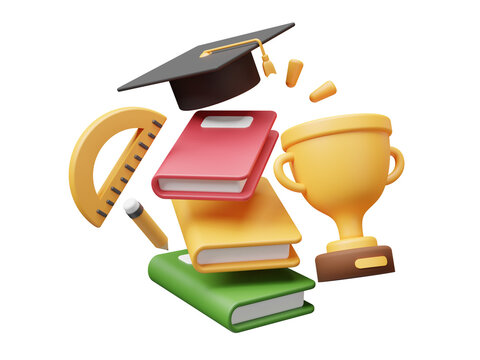 3d floating book stack, trophy graduation hat, ruler and pencil, illustration of graduation, school and education