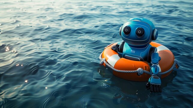 Adorable Blue Robot Floating on Orange Lifebuoy in Ocean Water