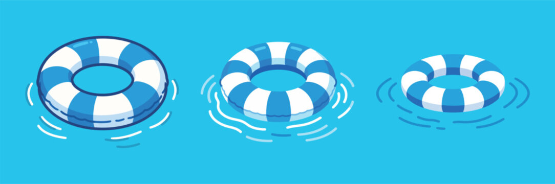 Three blue and white striped lifebuoys floating on a blue water background, symbolizing safety, summer, and recreational water activities.