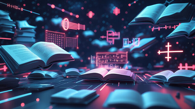 A mesmerizing futuristic educational cyberspace featuring floating holographic books, glowing mathematical equations, and digital knowledge streams. The deep-space background with neon lighting adds t