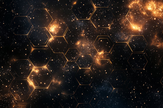 A cosmic-themed podium with a nebula-filled background, floating planets and stars, and space decorations like rockets and satellites for a futuristic World Space Week celebration.