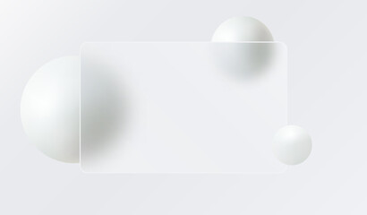 Glass morphism landing page with square frame. Vector illustration with blurry floating spheres in white.