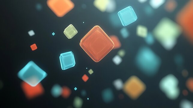 Abstract motion view digital grid with colorful floating squares, showcasing a deep perspective and vibrant bokeh effects on a dark blue, futuristic background.