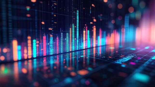 White polyline graph zigzagging over blue grid with star nodes, floating UI tags in flat design