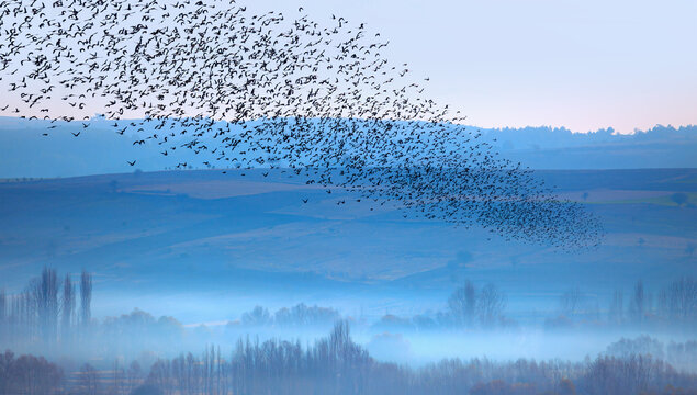 Greater white-fronted goose wedge in flight. Vector silhouette a flock of birds