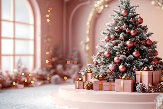 Flocked Christmas tree with rose gold ornaments and pink gift boxes decorated snow