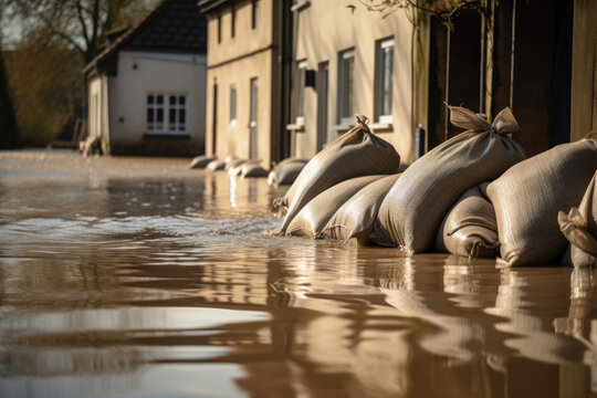 Close shot of flood Protection Sandbags with flooded homes in the background. - AI Generated